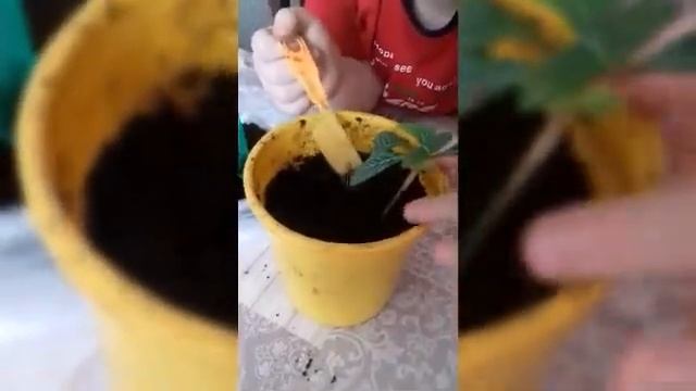 Я несколько дней собиралась посадить росточек, даже приготовила горшок с землёй, но руки никак не доходили... мой 5 летний сынок Степан решил мне помочь))) Посмотрите что из этого получилось; )))