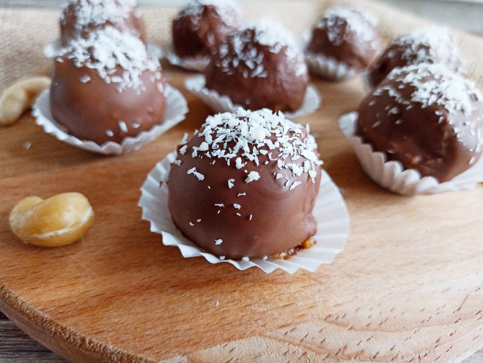 Ингредиенты (для 8 средних конфет): Финики с косточкой – 150 г Кешью – 100 г Молочный шоколад – 90 г Кокосовая стружка/дробленные орешки для украшения – по желанию Приятного аппетита! ****************