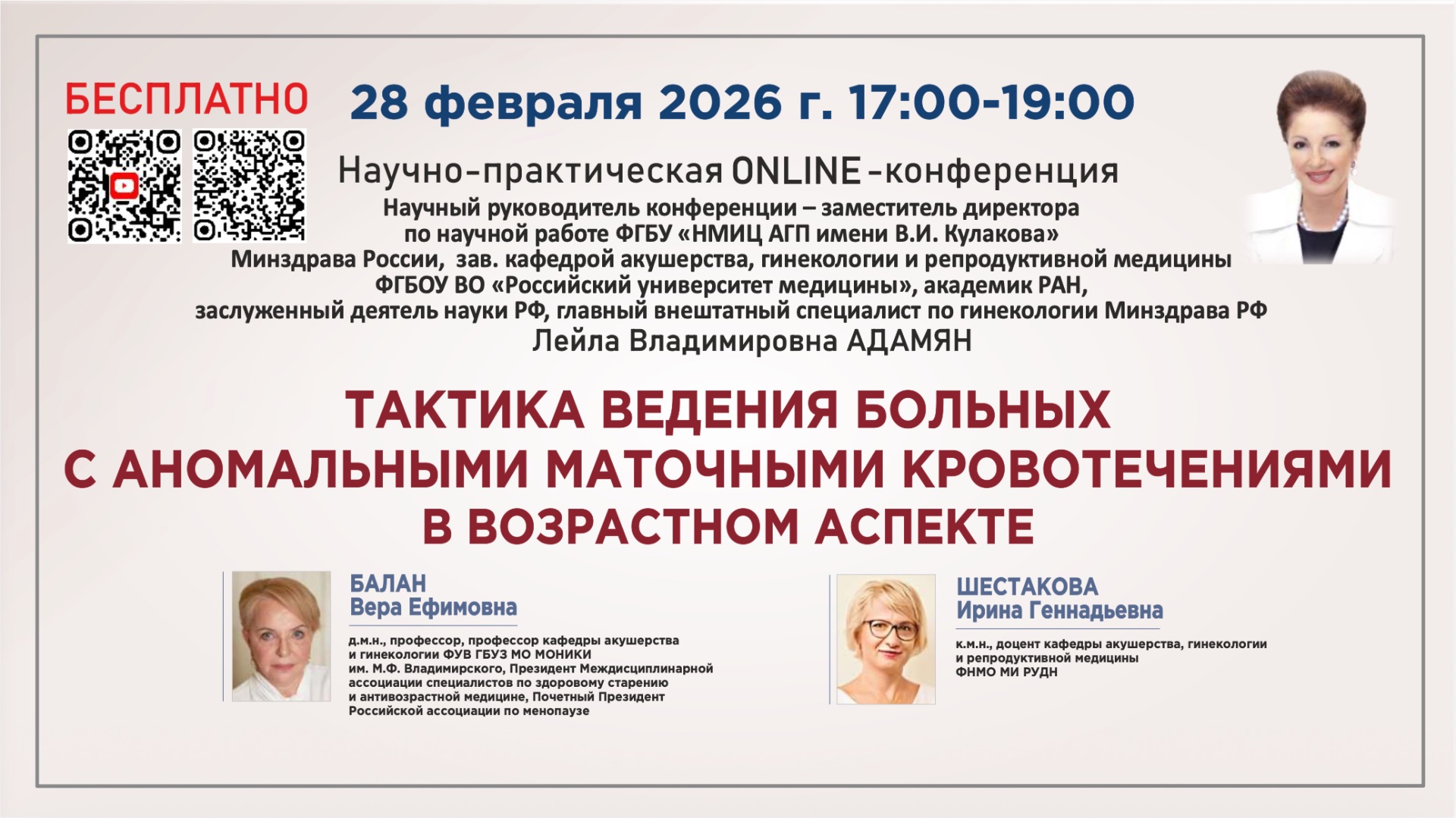 Научно-практическая онлайн конференция: ТАКТИКА ВЕДЕНИЯ ПРИ АМК И МЕНОПАУЗАЛЬНЫХ РАССТРОЙСТВАХ ------------------------------------------------------------- НАУЧНЫЙ РУКОВОДИТЕЛЬ КОНФЕРЕНЦИИ: АДАМЯН Лейла Владимировна Заместитель директора ФГБУ «НМИЦ акушерства, гинекологии и перинатологии имени В.И. Кулакова» Минздрава России, зав. кафедрой репродуктивной медицины и хирургии ФГБОУ ВО «Российский университет медицины», академик РАН, заслуженный деятель науки РФ, главный внештатный специалист по гинекологии Минздрава РФ ------------------------------------------------------------- СПИКЕРЫ: БАЛАН Вера Ефимовна — д.м.н., профессор, профессор кафедры акушерства и гинекологии ФУВ ГБУЗ МО МОНИКИ им. М.Ф. Владимирского, Президент Междисциплинарной ассоциации специалистов по здоровому старению и антивозрастной медицине, Почетный Президент Российской ассоциации по менопаузе ШЕСТАКОВА Ирина Геннадьевна — к.м.н., доцент кафедры акушерства, гинекологии и репродуктивной медицины ФНМО МИ РУДН ------------------------------------------------------------- ПРОГРАММА КОНФЕРЕНЦИИ: 1) "РАСШИРЕНИЕ НЕГОРМОНАЛЬНЫХ ВОЗМОЖНОСТЕЙ ДЛЯ КОНТРОЛЯ МЕНОПАУЗЫ" ( БАЛАН Вера Ефимовна ) 2) "АНОМАЛЬНЫЕ МАТОЧНЫЕ КРОВОТЕЧЕНИЯ: ОТ УНИВЕРСАЛЬНЫХ АЛГОРИТМОВ К ПЕРСОНАЛИЗИРОВАННОЙ ТАКТИКЕ" ( ШЕСТАКОВА Ирина Геннадьевна ) «Дискуссия. Ответы на вопросы» Адамян Л.В., Балан В.Е., Шестакова И.Г.