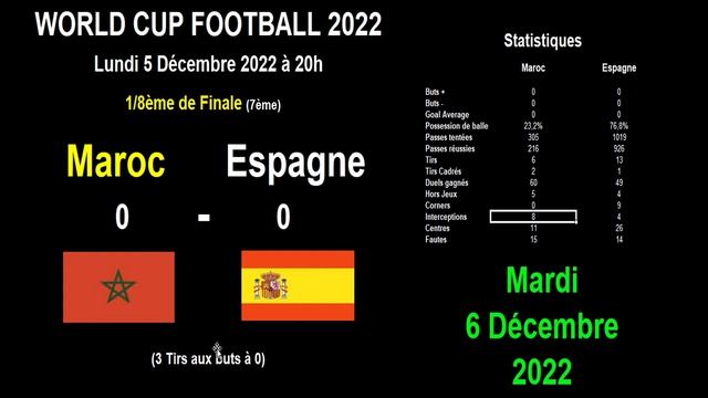 Je vous retrouve pour les résultats de la 17ème journée de matchs de la coupe du monde de football 2022 au Qatar (le 6 décembre 2022). Le Maroc affrontait l'Espagne pour un match au bout du suspense qui s'est terminé par un 0 à 0. Le gardien marocain a ensuite été exceptionnel en arrêtant les 3 pénaltys de l'Espagne et le Maroc l'a emporté 3 tirs aux buts à 0. Dans l'autre match le Portugal affrontait la Suisse. Et le match a été à sens unique avec une énorme victoire des portugais 6 buts à 1. Je vous communiquer les scores, buts et toutes les statistiques en détail des matchs : Maroc - Espagne : 0-0 (3 tirs aux buts à 0) Portugal - Suisse : 6-1 Je vous donne ensuite le calendrier des matchs de demain et les affrontements possibles en quart de finale. Et je vous communique le classement mis à jour des buteurs de cette coupe du monde. N'hésitez pas à vous abonner à ma chaîne Magic Gaming sur @YouTube en cliquant sur # S'ABONNER #, c'est gratuit ?! ? https://www.youtube.com/c/MagicGamingCartes N'hésitez pas à me suivre également sur : ? @Instagram : http://instagram.com/magic00gaming ? @Twitter : https://twitter.com/MagicGa08074364 Et aussi n'hésitez pas à mettre des commentaires et des pouces positifs? si la vidéo vous plaît, cela aidera la chaîne à se développer, merci d'avance ?! #qatar2022 #worldcup2022 #football