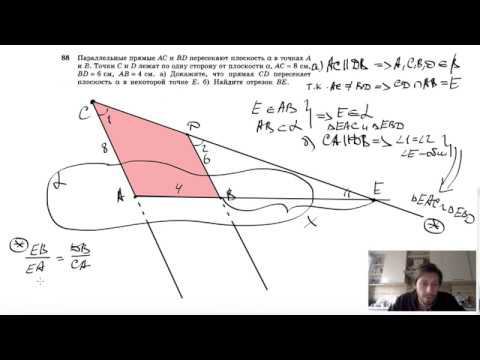 №88. Параллельные прямые АС и BD пересекают плоскость α соответственно в точках А и В. Точки С и D лежат по одну сторону от плоскости α, AС = 8 см, BD = 6 см, АВ = 4 см. а) Докажите, что прямая CD пересекает плоскость α в некоторой точке Е. б) Найдите отрезок BE. Поддержать канал рублём - 5469400944002125 (Сбербанк) Мой второй канал для подготовки к ЕГЭ и ОГЭ - https://www.youtube.com/ЕвгенийСумин Инстаграм - https://www.instagram.com/EGE_OGE.math Личный инстаграм - https://www.instagram.com/ee_sumin VK - https://vk.com/evgeniysumin FB - https://www.facebook.com/EvgeniySumin
