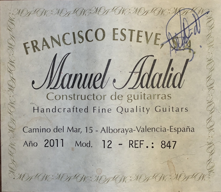 Гитара Francisco Esteve Manuel Adalid 12 Характеристики: Верхняя дека: кедр или ель (массив) Нижняя дека и обечайка: палисандр (массив) Гриф: красное дерево, усилен чёрным деревом Накладка: чёрное дерево Бридж: палисандр Производство Испания