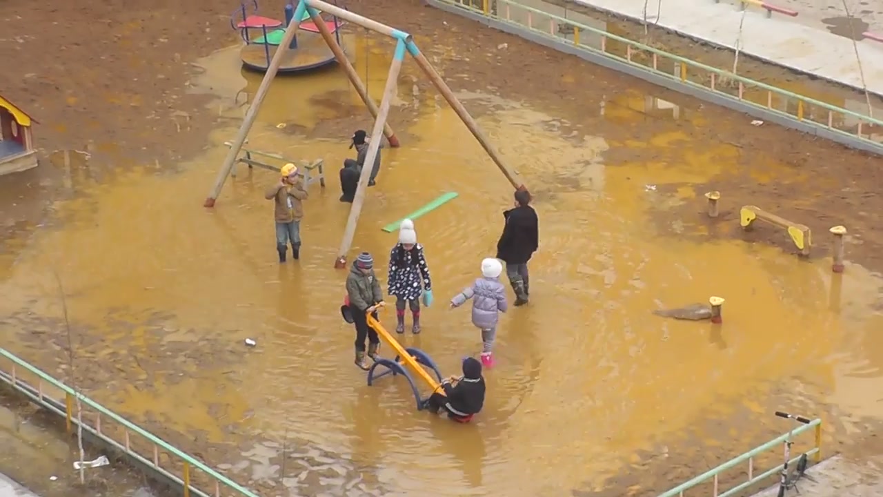 По словам автора, видео снято 23 апреля во дворе одного из домов в Якутске. Вторая половина площадки не была залита водой, однако дети её проигнорировали.