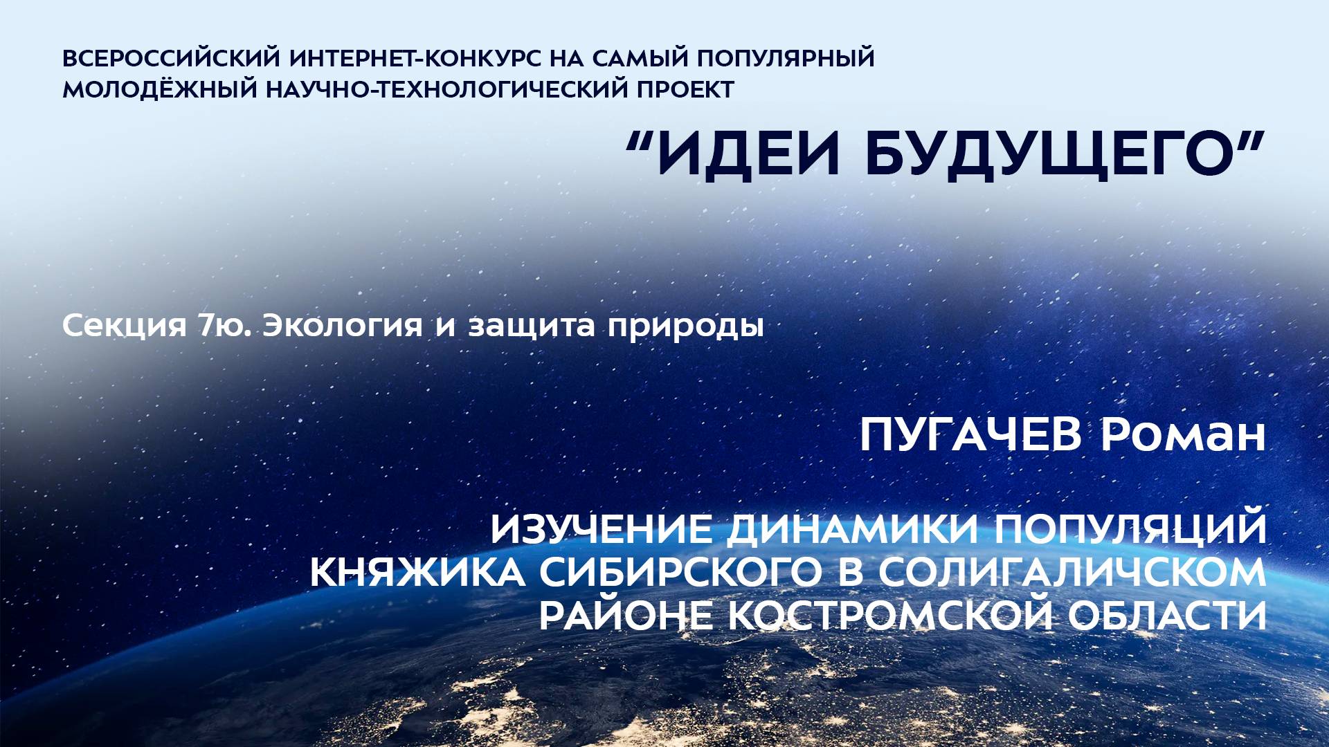 (7Ю-11) ПУГАЧЕВ Роман Денисович Костромская область, г. Солигалич МКОУ «Солигаличская СОШ», 7 класс ИЗУЧЕНИЕ ДИНАМИКИ ПОПУЛЯЦИЙ КНЯЖИКА СИБИРСКОГО В СОЛИГАЛИЧСКОМ РАЙОНЕ КОСТРОМСКОЙ ОБЛАСТИ Научный руководитель: Пугачева Анна Петровна, Костромская область, г. Солигалич, ОГКУ «Солигаличское лесничество», государственный инспектор по охране леса Более подробно о мероприятиях Программы "Шаг в будущее" можно узнать на сайтах http://www.step-into-the-future.ru/ и http://шагвбудущее.рф