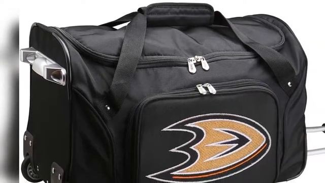 NHL Wheeled Duffle Bag Get this item: https://amzn.to/2ZITKmf About the Product: 900D Nylon Imported TEAM FANDOM: Features team colored embroidered logo of your favorite team, the Anaheim Ducks TELESCOPING HANDLE: Maneuver in tight spaces with the telescoping design and two-inline wheels that makes pulling and pushing the duffel effortlessly BOASTS PLENTIFUL STORAGE: Features spacious top main compartment and zippered side pocket. Expanded Measurements: 22" H x 12" W x 12" D IDEAL USE: Perfect weekend bag, suitable for overnight travel, camping, airplane travel or storing sports equipment MADE TO LAST: Made of durable 900D nylon fabric and durable self-healing zippers and shoulder straps