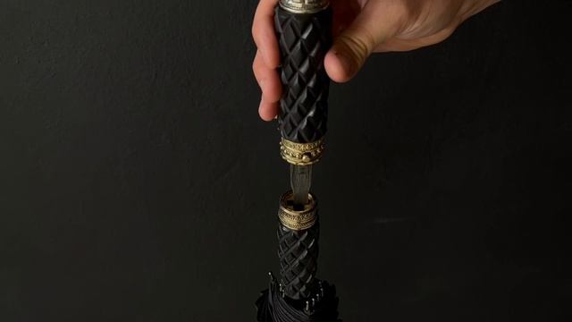 Эксклюзивная работа - зонт с клинком «Волчий Берсерк». Литье мельхиор, рукоять дерево - черный граб, резьба - мелкий ромб. Клинок - кованый дамаск 400 слоев. Надежный зонт против дождя и ветра, купол 121 см и 16 спиц.