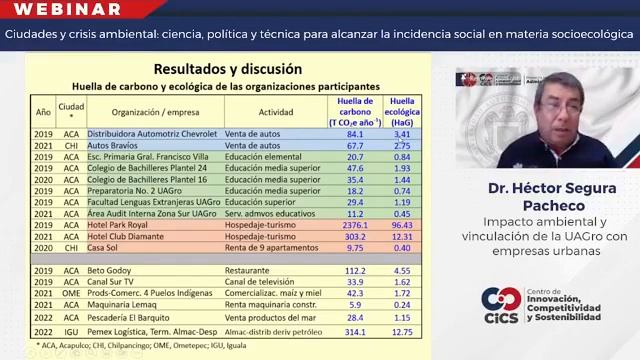 Participación en el Webinario: Ciudades y crisis ambiental: ciencia, política y técnica para alcanzar la incidencia social en materia socioecológica. Evento organizado por el Centro Universitario CIFE y el Centro de Innovación, Competitividad y Sostenibilidad Universidad de la Universidad Autónoma de Guerrero Título de la Ponencia: Violencia económica e injusticia ambiental en México”. Fecha: 19 de noviembre de 2022. Tipo de actividad: Divulgación y Acceso Universal del Conocimiento