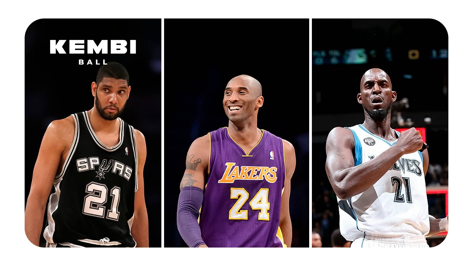 Kobe Bryant was a legendary shooting guard for the Los Angeles Lakers, defined by his "Mamba Mentality," relentless work ethic, and five NBA championships. Tim Duncan was the fundamentally perfect power forward/center for the San Antonio Spurs, whose quiet leadership and consistency anchored a dynasty that won five titles. Kevin Garnett was an intense, versatile big man whose defensive passion, vocal leadership, and all-around game revolutionized the power forward position and earned him a championship.
