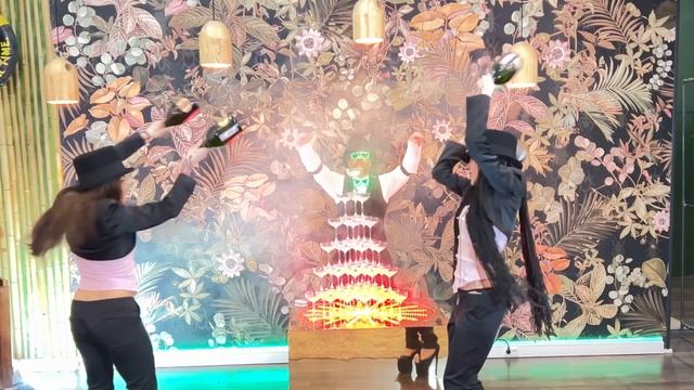 Лучшая команда барменов barshow.ru предлагает уникальное шоу "Брызги шампанского". Девушки и бармен демонстрируют шоу технику флеринга, баланса и танцев готовя пирамиду из шампанского и угощают гостей мероприятия. Пирамида с подсветкой крутится на столе и выходят с четырех сторон дым. Это очень эффектно.