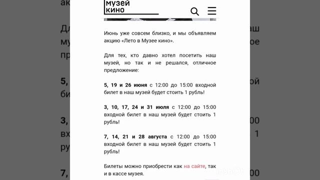 В Музей кино можно попасть за 1 ₽ по понедельникам Музей проводит акцию «Лето в Музее кино»: вход на все выставки и постоянную экспозицию стоит всего 1 ₽. Там вы сможете ознакомиться с экспозициями: «Снимал он трудный быт войны» (посвящена 80-летию победы в Сталинградской битве), «На пыльных тропинках далеких планет…» (о научной фантастике в кино) и «Вертикаль» (посвящена Станиславу Говорухину). Также доступна постоянная выставка «Лабиринт истории» и экспозиция «Кабинет Сергея Эйзенштейна» с личными вещами режиссёра. Вход 1₽ https://www.museikino.ru/about/ ? Каждый понедельник 12:00-15:00, до сентября ? пр-т Мира, 119, стр. 36 #2023 #россия #москва #вднх