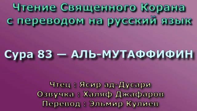 Чтение^Озвучка - Корана Чтец: Ясир ад-Дусари Озвучка: Халяф Джафаров Перевод: Эльмир Кулиев Источник YouTube канал: " Священный Коран "