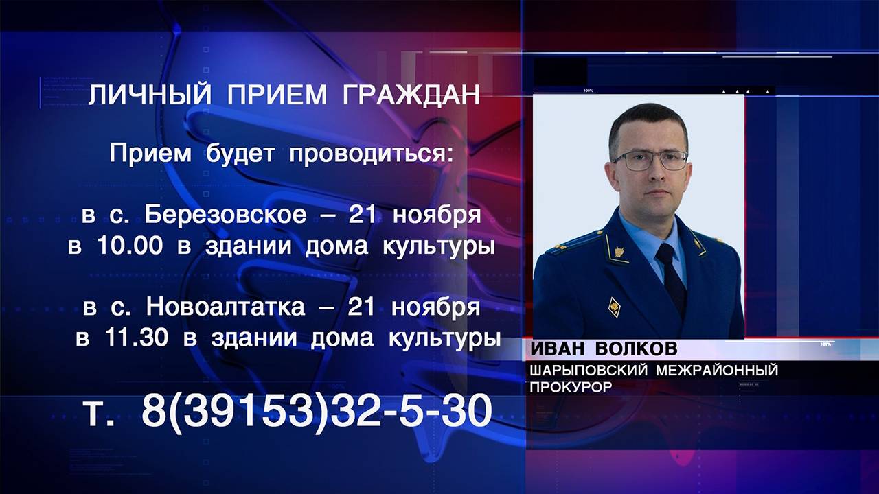 Шарыповский межрайонный прокурор Волков Иван Александрович проведет личный прием граждан в отдаленных населенных пунктах Шарыповского муниципального округа 21 ноября 2024 года