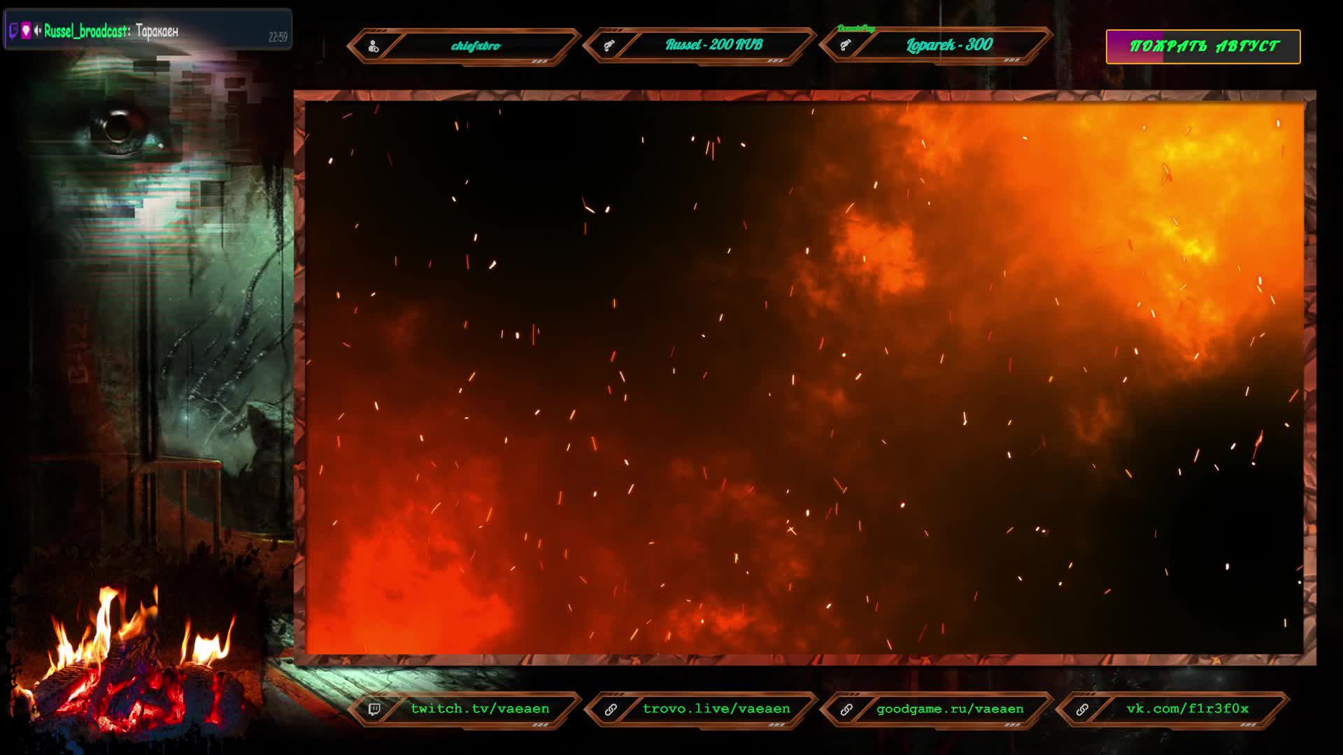 Если хотите поддержать меня как стримера - нажмите по данной ссылке https://www.donationalerts.com/r/f1r3f0x Donate for USD, EU all world - https://new.donatepay.ru/@vaeaen Во время стрима ваше сообщение появится на экране, и будет сопровождаться голосовым диктором. Поддержка на прямую: Сбер: 2202 2010 0629 1039 Тинькофф: 2200 7008 4677 0625 Основные каналы: Twitch: https://www.twitch.tv/vaeaen GoodGame: https://goodgame.ru/channel/Vaeaen/ Trovo: https://trovo.live/Vaeaen Дополнительные: Boosty: https://boosty.to/vaeaen VKplay: https://vkplay.live/vaeaen Wasd: https://nuum.ru/channel/vaeaen YouTube: https://www.youtube.com/channel/UCsl3CyRcImUYtWiCgEdvmjQ