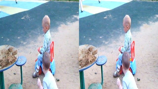 Маленький Тема (2 года) гуляет в парке, катается с горки и на детской машинке. Видео в формате 3d для 3d очков. 20160717
