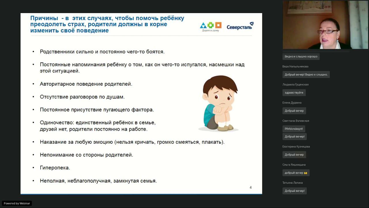 Ведущий - Яна Воронкова, психолог проекта «Вместе». Содержание: - причины, которые вызывают страхи у детей - что должны сделать родители, если их ребенок столкнулся с подобной проблемой - психотравмирующие ситуации - виды страхов - способы преодоления страхов - игры и упражнения для преодоления страхов в домашней родительский практике. Вебинар состоялся в рамках проекта «Родительское просвещение» благотворительного фонда «Дорога к дому» компании «Северсталь».