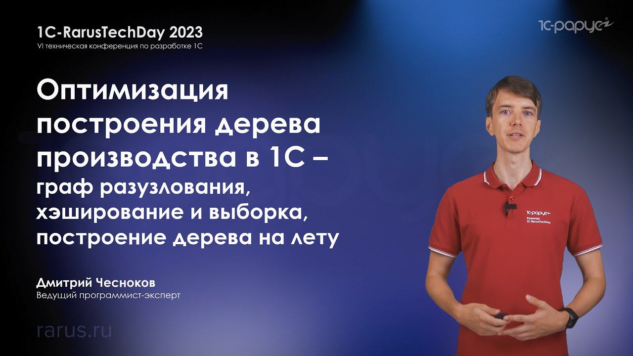 Оптимизация построения дерева производства в 1С — граф разузлования, хэширование и выборка, построение дерева на лету. Чесноков Дмитрий, ведущий программист-эксперт. Программа конференции и отдельные записи докладов (будут добавлены после 24 июля 2023): https://rarus.ru/events/20230720-1c-rarustechday-2023-587081/ Список предстоящих мероприятий 1С-Рарус: https://rarus.ru/events/