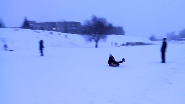 Выпал снег. Народные гуляния, катание с горки на ватрушках у земляного вала.mp4