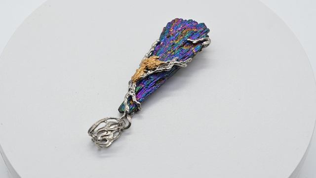•Авторское украшение ручной работы. •Камни установлены в оправу из ювелирного сплава – нейзильбер с покрытием платино-рутения и позолотой. •Форма и рисунок камня никогда не повторяются, что делает данное изделие единственным в своем роде. •Размер указан без учета петли. •Вес 15 г •Кианит титановый - черный кианит покрытый титановым сплавом. •Покрытие дает прочность и добавляет радужный перелив цвета. Цена: 8 266 руб. https://radugakamnya.ru/catalog/ukrasheniya_iz_kamnya_po_tipam/kulony_i_podveski/kulon_kianit_27_66mm-610365/