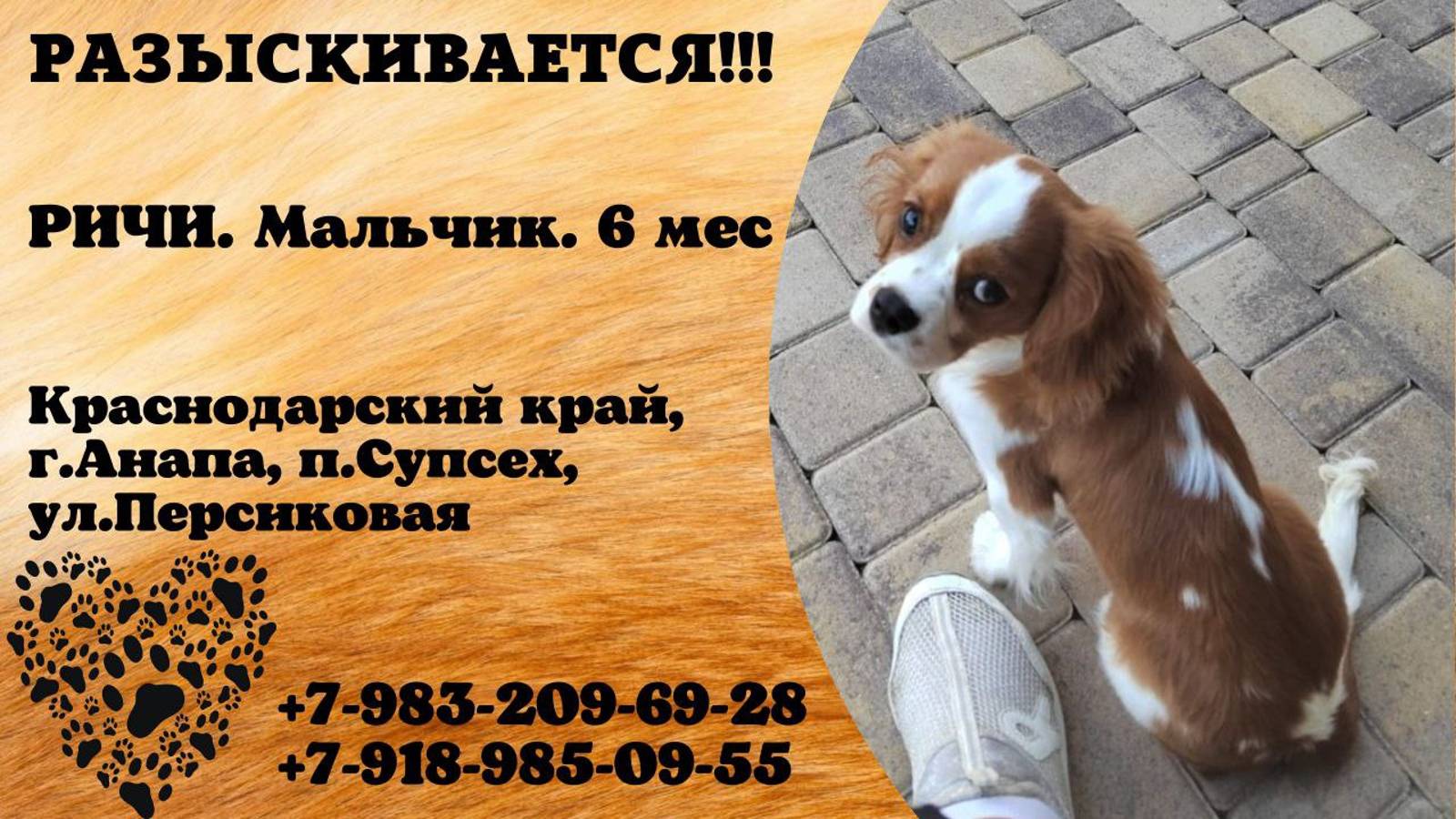 Краснодарский Анапа, п.Су-Псех Пропала собака 25.09 ул.Персиковая. Мальчик Ричи, 6 мес, есть клеймо. Тел. +7 983 209-69-28 Инфо https://vk.com/wall-198815410_154423