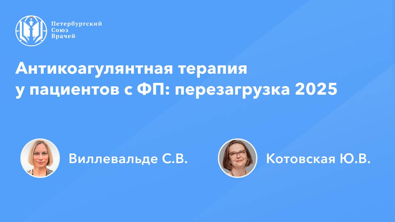 Антикоагулянтная терапия у пациентов с ФП: перезагрузка 2025 Дата проведения: 23.04.2025, 20:00 Страница мероприятия: https://spb.doctor/i/250423/ Программа: 1. Антикоагулянтная терапия у пациентов с ФП: перезагрузка 2025 Виллевальде Светлана Вадимовна, Котовская Юлия Викторовна 2. Редкие и нередкие тромбоз-ассоциированные состояния в кардиологии Котовская Юлия Викторовна 3. Ответы на вопросы О семинаре: Реализация мер профилактики кардиоэмболических событий становится сложнее с увеличением возраста пациентов из-за повышенного риска геморрагических осложнений, снижения функции почек и других рисков. В рамках онлайн-семинара будут представлены ключевые изменения в принципах ведения коморбидных пациентов с фибрилляцией предсердий (ФП), обсуждены подходы к антикоагулянтной терапии в сложных группах пациентов с нарушением функции почек, печени, экстремальными значениями массы тела, в периоперационном периоде и др.
