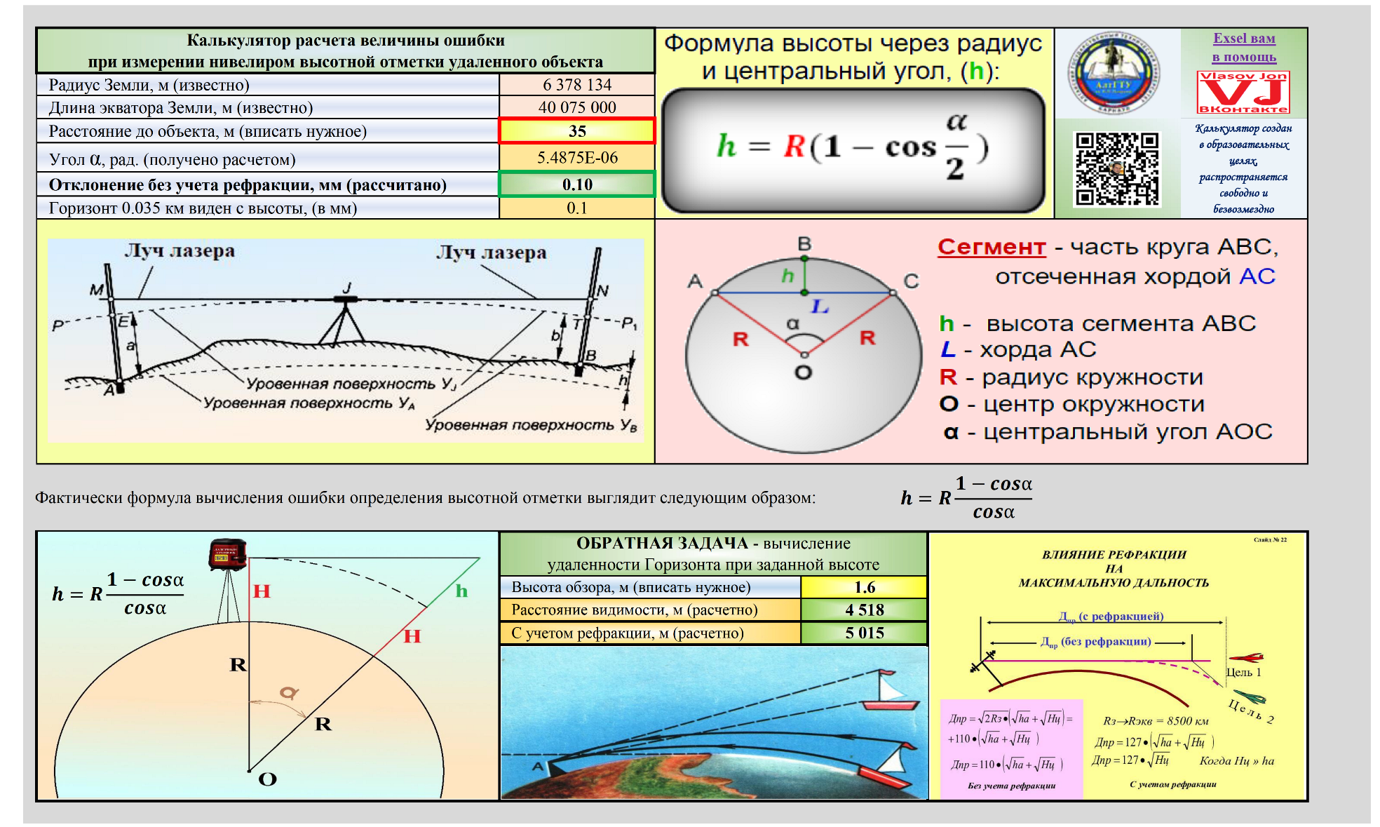 Вышел в свет Калькулятор в Excel "Расчет ошибки при определении высотной отметки удаленного объекта лазерным нивелиром". Позволяет определить предел ошибки измерений при заданном удалении. Например при удалении объекта на 500 метров - ошибка замера высотной отметки составляет 5 мм. Скачать можно бесплатно и безвозмездно по ссылке https://disk.yandex.ru/i/cfLH9DoYKvCvkA На более удаленных объектах ошибка растет геометрически, так имеются сведения, что при строительстве взлетно-посадочной полосы строители на длине три километра пользовались оптическими нивелирами и при сдаче все удивлялись, как удалось сделать полосу словно утюгом - но после дождя в середине дороги образовалась лужа глубиной пятнадцать сантиметров!