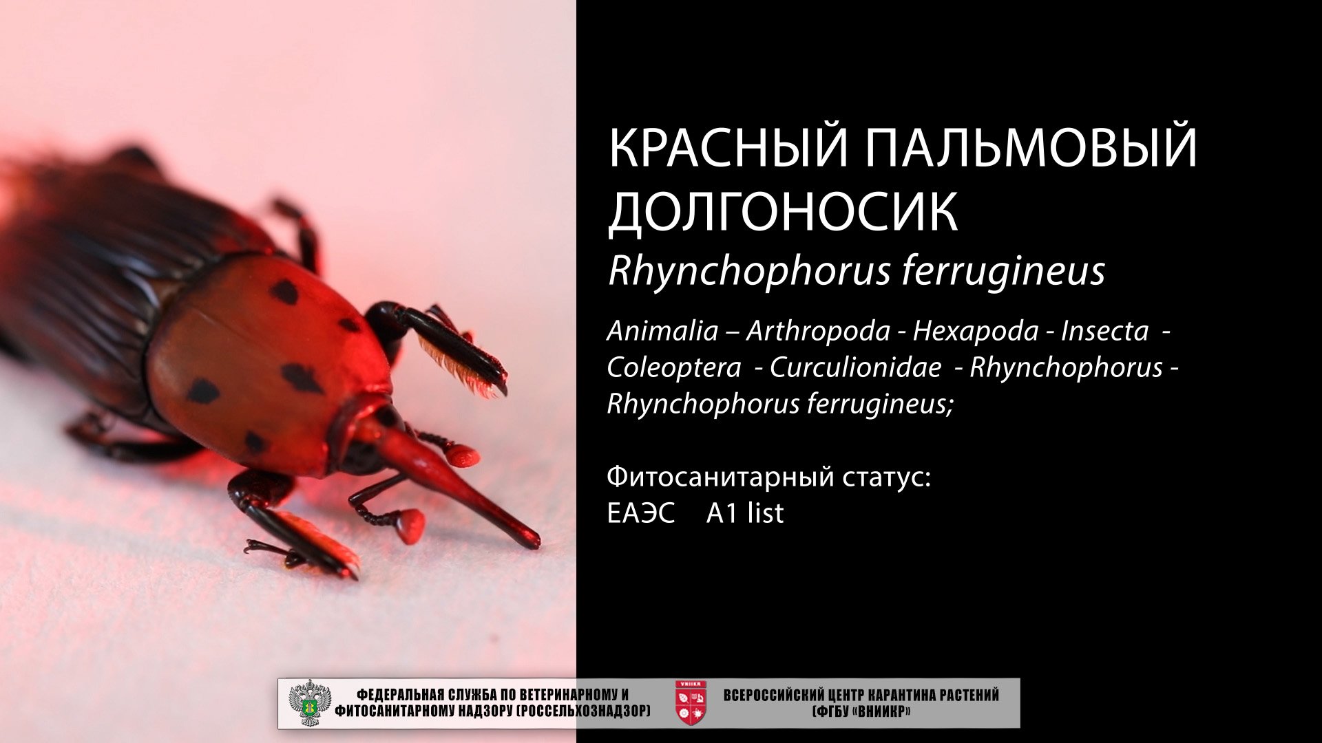 Красный пальмовый долгоносик (Rhynchophorus ferrugineus) - опасный карантинный фитофаг, нападает на 40 видов пальм из 23 родов.