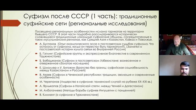 В докладе будет представлен проект коллективной монографии «Суфизм после СССР», планируемой к изданию в конце 2021 года. Книга должна стать результатом крупнейшего исследования, в котором будут объединены работы 22 авторов в области современного суфиеведения. Идея книги родилась из осознания существующей на сегодняшний день лакуны в изучении суфийских сетей на территории бывшего СССР. Весьма незначительный объем региональных исследований, посвященных современному суфизму, не позволяет сформировать полноценную обобщающую картину динамики его распространения и трансформации. Что же касается новых форм практики суфизма, распространенных среди немусульманского населения крупных городов, которые объединены в научном дискурсе термином «неосуфизм», то их изучение пока остается вне академического внимания. Цель сборника в том, чтобы вызвать интерес авторов к исследованиям по данной тематике и объединить наиболее значимые работы, основанные, в первую очередь на полевых этнографических материалах. Докладчик: Панков Игорь Александрович — кандидат исторических наук (МАЭ РАН (Кунсткамера)), руководитель направления «Тасаввуф в современном мире» (Международный центр исламских исследований (МЦИИ)), заместитель директора Петербургского Музея Исламской Культуры.