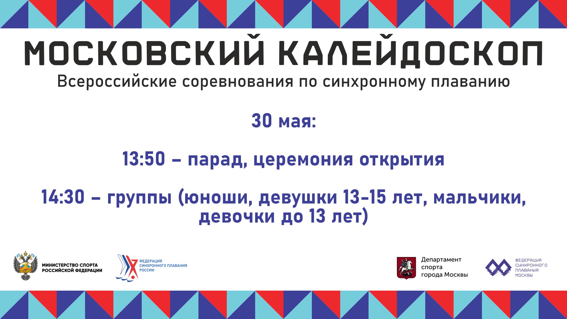Всероссийские соревнования «Московский калейдоскоп» 4 этап ГРАН-ПРИ по синхронному плаванию Место проведения: г. Москва Сроки: 28 мая - 2 июня 2024 года Официальная страница соревнований: https://synchrorussia.ru/kalendar/2024/vs-mk