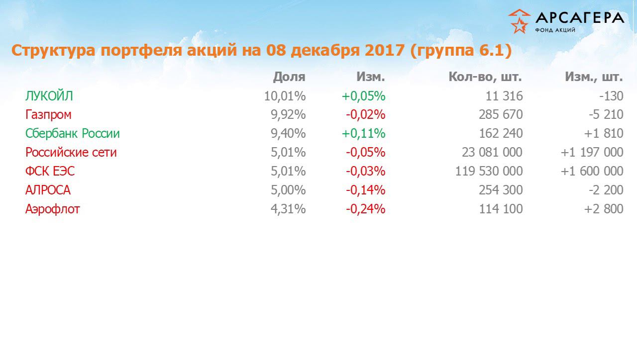 Заместитель начальника аналитического управления УК Арсагера Андрей Валухов в программе «Наши фонды» с анализом фонда «Арсагера – фонд акций» за период с 24 ноября по 08 декабря 2017 года. За отчетный период стоимость пая и индекс МосБиржи изменились отрицательно. Переходим к активам фонда. Состав и структура группы 6.1 портфеля фонда «Арсагера – фонд акций» на 08.12.17 В группе 6.1 покупали акции Сбербанка, Россетей, ФСК ЕЭС и Аэрофлота. Продавали бумаги остальных эмитентов. Состав и структура группы 6.2 портфеля фонда «Арсагера – фонд акций» на 08.12.17 В группе 6.2 покупали акции Группы ЛСР, МРСК Центра и Приволжья, ОГК-2. Продавали бумаги Энел Россия и префы Мечела. Состав и структура группы 6.3 портфеля фонда «Арсагера – фонд акций» на 08.12.17 В группе 6.3 покупали акции МРСК Центра и МРСК Волги. В группе 6.4 покупали акции ЧМК. Отраслевая структура портфеля фонда «Арсагера – фонд акций» на 08.12.17 В отраслевой структуре фонда существенных изменений не происходило. Протоальфа портфеля фонда «Арсагера – фонд акций» на 08.12.17 На экране представлены агрегированные фундаментальные показатели портфеля фонда и индекса МосБИржи. Показатели рассчитываются исходя из текущих цен акций, а также прогнозов по прибыли и балансовой стоимости компаний по итогам 2017 года. Мы стремимся в долгосрочном периоде превосходить результаты индексного фонда. Рейтинги фонда «Арсагера – фонд акций» на 07.12.2017 На ваших экранах информация о местах фонда в рейтингах по доходности и изменении стоимости пая и индекса МосБиржи. В заключение наш постулат №9: Качество результатов управления познается в сравнении с рынком
