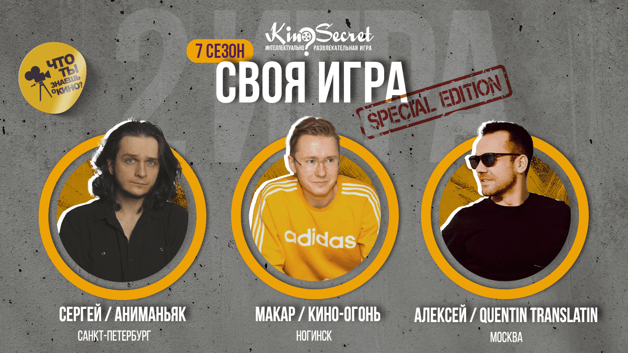 Вторая игра 7-го сезона KinoSecret в формате "Своей игры". Специальный сезон участниками которого стали различные киноблогеры YouTube Участники 2-й игры: 1. Сергей (г. Санкт-Петербург) - канал "Аниманьяк" Ссылка на канал: https://www.youtube.com/c/animaniac/featured 2. Макар (г. Ногинск) - канал "Кино-Огонь" Ссылка на канал: https://www.youtube.com/c/%D0%9A%D0%B8%D0%BD%D0%BE%D0%9E%D0%B3%D0%BE%D0%BD%D1%8C 3. Алексей (г. Москва) - канал "Quentin Translatin" Ссылка на канал: https://www.youtube.com/c/QuentinTranslatin Подписывайтесь на каналы ребят, они делают интересные вещи!) -------------- Хотите первыми потестировать пакет вопросов Своей Игры еще до того как выйдет выпуск и принять участие в закрытой игре? Вступайте в наш телеграм-канал: https://t.me/QuizKinoSecret -------------- Хотите стать участником игры на канале? Отправьте вашу заявку согласно инструкции из этого видео: https://youtu.be/AYPrJH0AJ_I Как только начнется отбор на новый сезон, мы с вами свяжемся -------------- Хотите стать автором вопросов? Отправьте примеры работ на почту - info@kinosecret.com ------------- Другие наши игры в формате "СТРИМ": https://www.youtube.com/playlist?list=PLhKq-j3AEmv18XslSaHrLWQg_rMo0gRnw Игры в формате "Дуэль": https://youtube.com/playlist?list=PLhKq-j3AEmv09tt-6UyEHTKgEUaxSmf9i Игры в формате "Своя игра": https://www.youtube.com/playlist?list=PLhKq-j3AEmv0jOx1qu9nRWTJn2jJNUT3D Тематические игры: https://www.youtube.com/playlist?list=PLhKq-j3AEmv0F5sIs-94xVZIIjkUwVK5y ------------- Если вам понравилась игра, вы можете поддержать нас и отправить донат по ссылке: https://www.donationalerts.com/r/kinosecret -------------- Наш Телеграм-Канал - https://t.me/QuizKinoSecret Наш сайт - http://www.kinosecret.com/ Наши игры в Иркутске - https://vk.com/kinosecret Наши подкасты - https://kinosecret.mave.digital/ Наш инстаграм - https://www.instagram.com/kinosecret_quiz/ Наша группа в ВК - https://vk.com/kinosecret_russia По условиям франшизы - http://www.kinosecret.com/franshisa/ Канал на Дзене - https://zen.yandex.ru/id/62203a86d211890fdf437eec Канал в RuTube - https://rutube.ru/channel/23802950/ #свояигра #квиз #quiz #квизонлайн #квизкино #киноквиз #киносекрет #викторина #киновикторина #онлайнкиноквиз #Угадайфильмпокадру #квизокино #квизвопросы #квизвопросыокино #квизвопросыкино #синемаквиз #cinemaquiz
