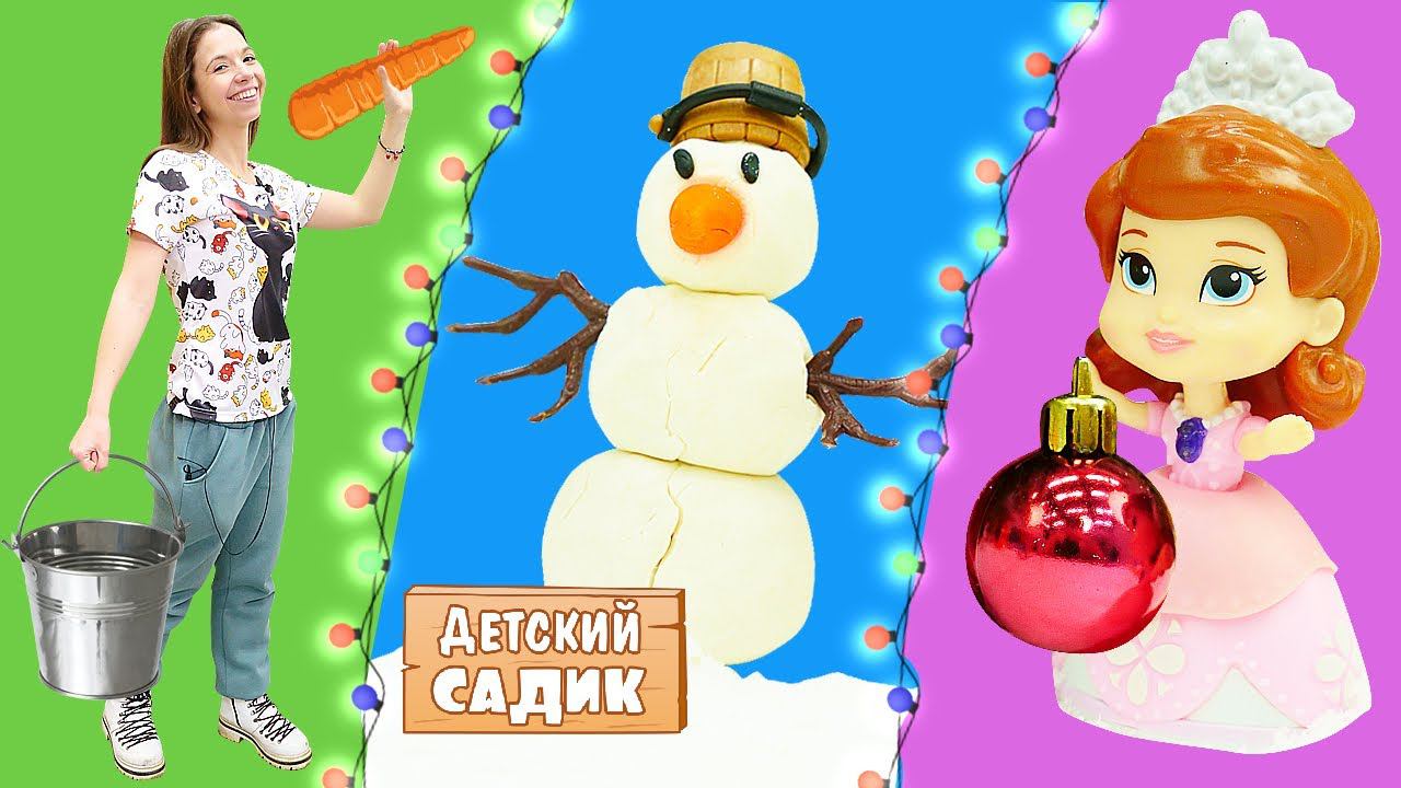 Новый Год для детей: лепим снеговика и готовим печенье из Плей До! Видео с игрушками Детский Садик