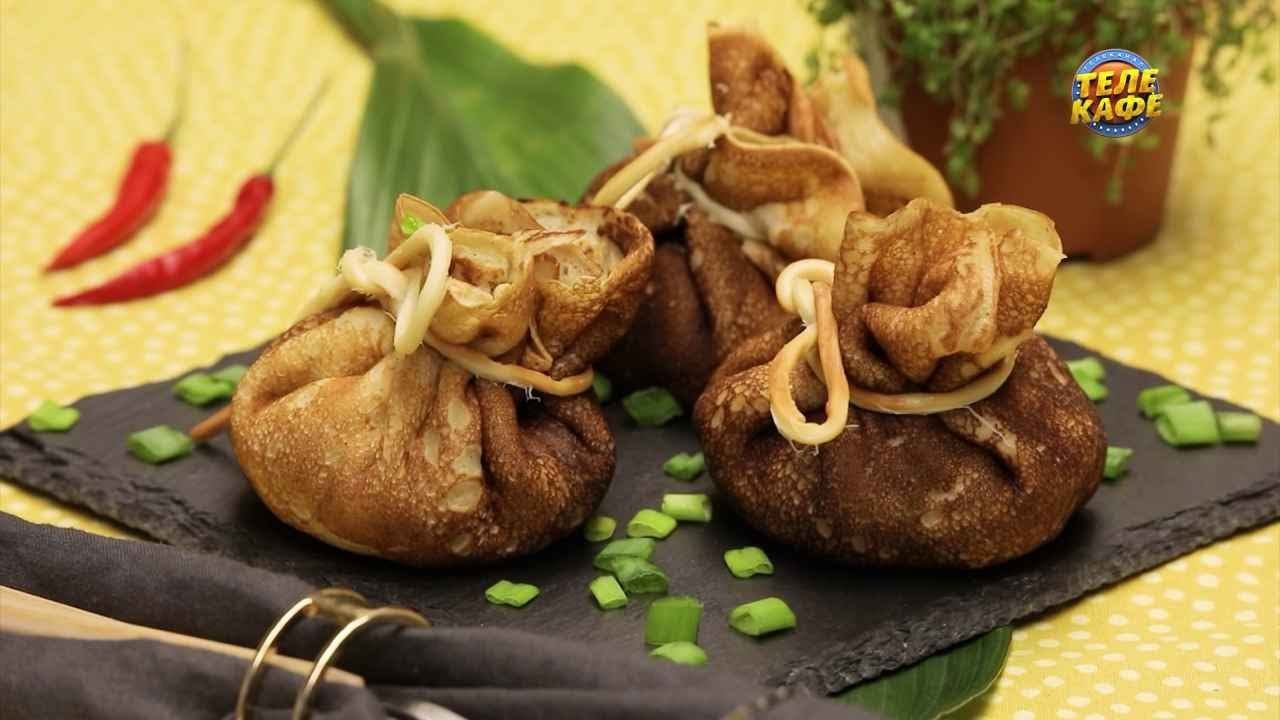 Блинные мешочки с курицей и грибами