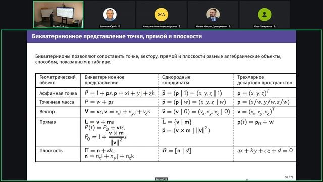 https://events.rudn.ru/event/287/ Применение алгебры винтов и бикватернионов для вычисления конечного винтового движения точек, прямых и плоскостей Геворкян Мигран Нельсонович доцент, к.ф.-м.н, доцент кафедра теории вероятностей и кибербезопасности РУДН В данном докладе представлено применение алгебры винтов и бикватернионов для вычисления винтового движения аффинных точек, свободных векторов, прямых и плоскостей. Алгебра винтов была разработана еще в конце 19 начале 20 веков, однако в настоящее время мало известна, хотя представляет собой весьма удобный и эффективный способ описания винтового движения. Особое внимание в докладе уделяется принципу перенесения Котельникова--Штуди, упоминания которого, судя по всему, практически не встречается в современных западных источниках. Доклад в целом носит методологический характер и призван устранить данный пробел, дав не только представления об основах математического аппарата перечисленных алгебр, но и проиллюстрировав применение данного аппарата на конкретных наглядных геометрических примерах. Application of the screw algebra and dual quaternions algebra for screw motion of points, lines and planes Gevorkyan, Migran Nelsonovich Docent, PhD, Associate Professor Department of Probability Theory and Cybersecurity, RUDN University We present the application of the screw algebra and dual quaternions algebra for screw motion of affine points, free vectors, lines and planes. The screw algebra was developed in the late 19th and early 20th centuries, but is currently little known, although it is a very convenient and effective way to describe screw motion. Special attention in the report is given to the principle of Kotelnikov--Study transfer, which, apparently, is practically not mentioned in modern Western sources. The report as a whole is methodological in nature and is intended to eliminate this gap, giving not only an idea of the basics of the mathematical apparatus of the listed algebras, but also illustrating the application of this apparatus with concrete illustrative geometric examples.
