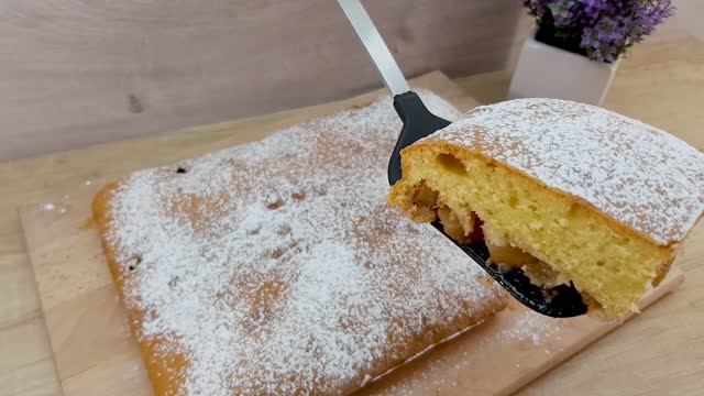 Очистить и нарезать 4 яблока 4 чайные ложки сахара 20 г сливочного масла Корица Тушить на среднем огне 3-5 минут. 3 больших яйца или 4 маленьких 140 г сахара 10 г ванильного сахара 80 г топленого масла 180 мл простокваши (молоко) 300 грамм муки 10 г разрыхлителя (1 столовая ложка) Форма для торта 21 * 31 см Выпекать 30-35 минут при 180 ° C. Аромат потрясающий! Приятного аппетита! Спасибо что, смотрите наши ролики! Если Вам не сложно, подпишитесь на наш канал, нам будет приятно! Если Вам понравился рецепт, поставьте ❤ и сделайте репост;) Вам мелочь а нам приятно.