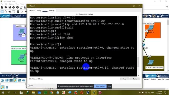 Router --------------------------------------- ena conf t int f0/0.10 encapsulation dot1q 10 ip add 192.168.10.1 255.255.255.0 exit int f0/0.20 encapsulation dot1q 20 ip add 192.168.20.1 255.255.255.0 exit int f0/0 no shut exit ip dhcp pool A network 192.168.10.0 255.255.255.0 default-router 192.168.10.1 exit ip dhcp pool B network 192.168.20.1 255.255.255.0 default-router 192.168.20.1 exit int s2/0 ip add 100.0.0.1 255.255.255.252 no shut exit router rip version 2 network 192.168.10.0 network 192.168.20.0 network 100.0.0.0 exit switch --------------- ena conf t vlan 10 name A vlan 20 name B exit int f0/1 switchport mode trunk exit int f0/2 switchport access vlan 10 exit int f0/3 switchport access vlan 20 exit
