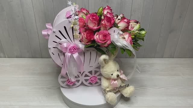 Коляска с живыми цветами на выписку девочки