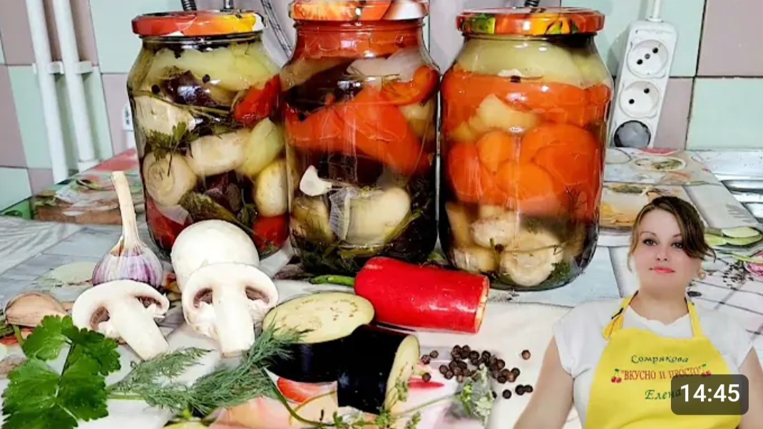 РЕЦЕПТ: Грибы шампиньоны.1,500.кг. Баклажаны.6.шт. Болгарский перец.1,500.кг. Лук.3.шт. Чеснок.1.гол. Стручковый острый перец.1.шт. Укроп.15.г. Петрушка.15.г. ДЛЯ РАССОЛА: Вода.2.л. Стебли от зелени. Уксус.9.%.8.ст.л. Подсолнечное масло.125.мл. Душистый горошек перец.4.шт. Чёрный перец горошек.1.ч.л. Сахар.8.ст.л. Соль.4.ст.л. ПРИЯТНОГО АППЕТИТА!?ПРОСТО И ВКУСНО!?