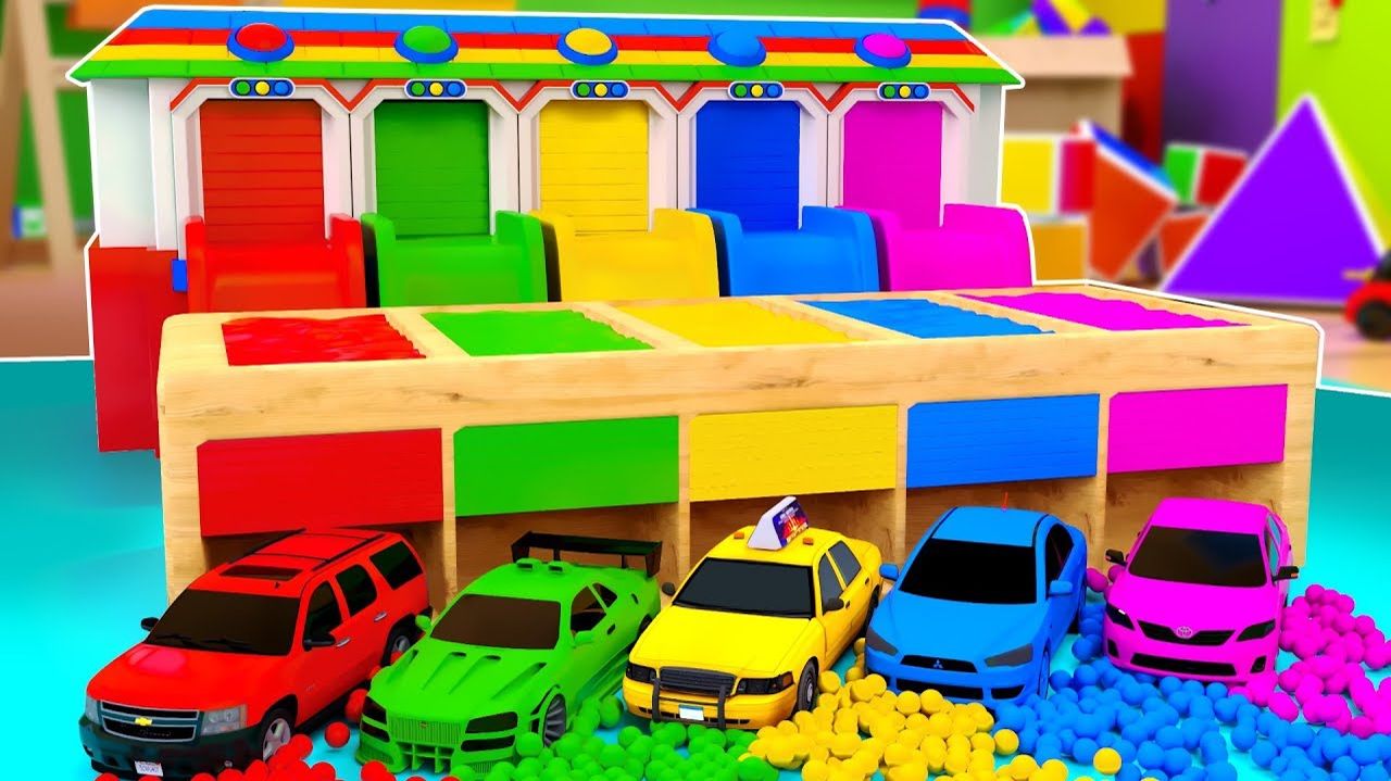 Изучаем цвета с игрушечными машинкоми! Скатитесь с горки и трамплина и упадите в бассейн с красками.