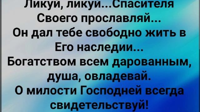 ХРИСТИАНСКИЕ ПЕСНИ ДЛЯ ХВАЛЫ И ПОКЛОНЕНИЯ ПРОСЛАВЛЕНИЯ ВООДУШЕВЛЕНИЯ ЕВАНГЕЛИЗАЦИИ ДУХОВНОГО РОСТА ПРОБУЖДЕНИЯ #господь#музыка#христианская_музыка#музика#христианскиепесни#бог#христианскиестихи#любовь#христианство#стихи#песня#песни#иисус#иисусхристос#иисусмойбог#иисус_христос#иисусбог#иисусгосподь#хвалы_и_поклонения#хваление#хвала#прославление#духсвятой#духовныйрост#духовноепробуждение#духовность#евангелие#евангелизация#евангельскаявесть#духовный_рост#пробуждение#рождество#рождествохристово#божий#божийнарод#божьеслово https://stihi.ru/avtor/zhanna70 "ТАНЦУЙ, ДУША МОЯ, СПАСЁННАЯ!" СЛОВА, МУЗЫКА, ОБРАБОТКА: ЖАННА ВОЛКОВА-ВАРЛАМОВА Стихи Жанна Волкова-Варламова https://stihi.ru/2025/01/03/6692 Танцуй, танцуй, душа моя, спасённая... Ликуй, ликуй... Прославляй Христа. Теперь ты в Нём, как вновь рождённая... Живёшь... за спиной крылья, обретя. Припев: Свет несёт мир Божий в минуты сложные... В руках Отца, душа нашла свой рай земной. Яви, Господь, душе чудеса всевозможные... Чтобы насытилась вдоволь Святой водой! Спасение тот дар, что Христом даровано... Держись Его, ведь, Он тебе свободу дал. Ты во Христе, душа...Ты в Нём Коронована... В наследие Великий Царь тебя призвал!!! Припев: Свет несёт мир Божий в минуты сложные... В руках Отца, душа нашла свой рай земной. Яви, Господь, душе чудеса всевозможные... Чтобы насытилась вдоволь Святой водой! Ликуй, ликуй...Спасителя Своего прославляй... Он дал тебе свободно жить в Его наследии... Богатством всем дарованным, душа, овладевай. О милости Господней всегда свидетельствуй! Припев: Свет несёт мир Божий в минуты сложные... В руках Отца, душа нашла свой рай земной. Яви, Господь, душе чудеса всевозможные... Чтобы насытилась вдоволь Святой водой! Танцуй, танцуй, душа моя, Богом обретённая... Ликуй, ликуй... К высотам Божьим стремись! Ты не одна в этом мире грёз...не обделённая... Вместе с Христом лети всегда только ввысь! В сердце моём горит пламя Небесное... Любовь проливается, излучая свет. Буду воспевать Господа я песнею... Да, будет Бог в моей песне воспет!!! Припев: Свет несёт мир Божий в минуты сложные... В руках Отца, душа нашла свой рай земной. Яви, Господь, душе чудеса всевозможные... Чтобы насытилась вдоволь Святой водой! 03.01.2025 Жанна Волкова-Варламова