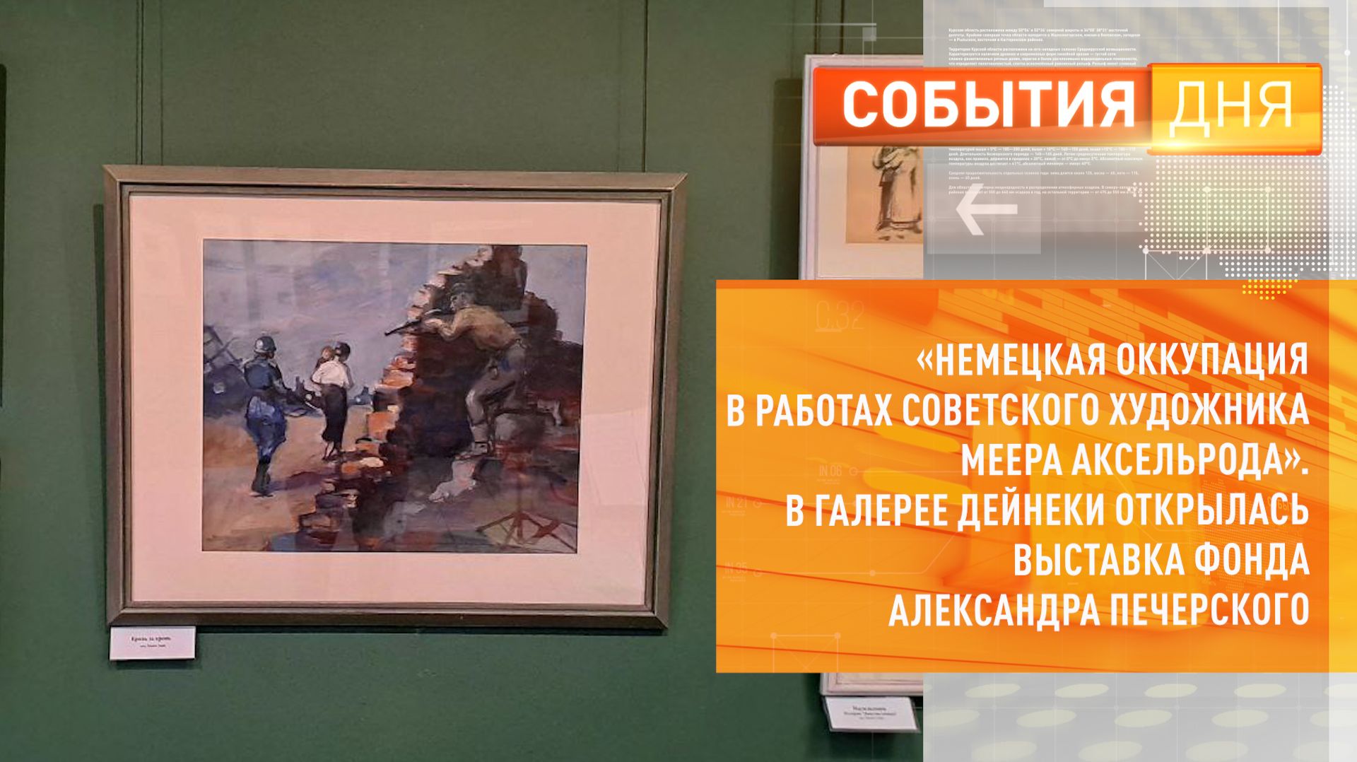 «Немецкая оккупация в работах советского художника Меера Аксельрода». В галерее Дейнеки открылась выставка из собрания Фонда памяти Александра Печерского. Около 50-ти графических листов из созданных в разное время серий «Гетто» и «Зверства немцев». А ещё эскизы иллюстраций к книгам о подпольщиках, партизанах и узниках концлагерей. Часть произведений экспонируется впервые. Выставку организовали и провели по инициативе губернатора Александра Хинштейна.