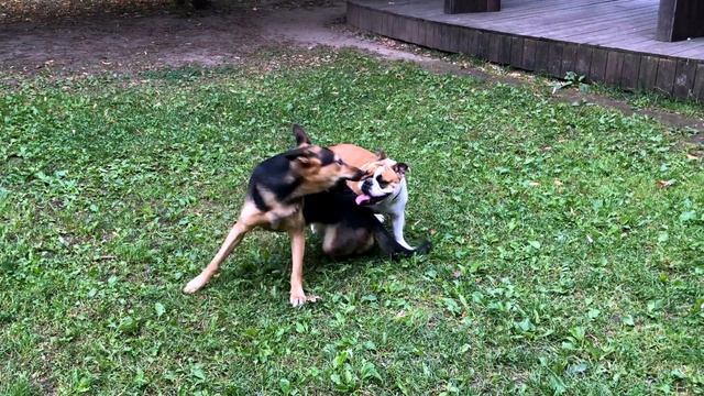 Английский бульдог Черри следит за безопасностью игры.