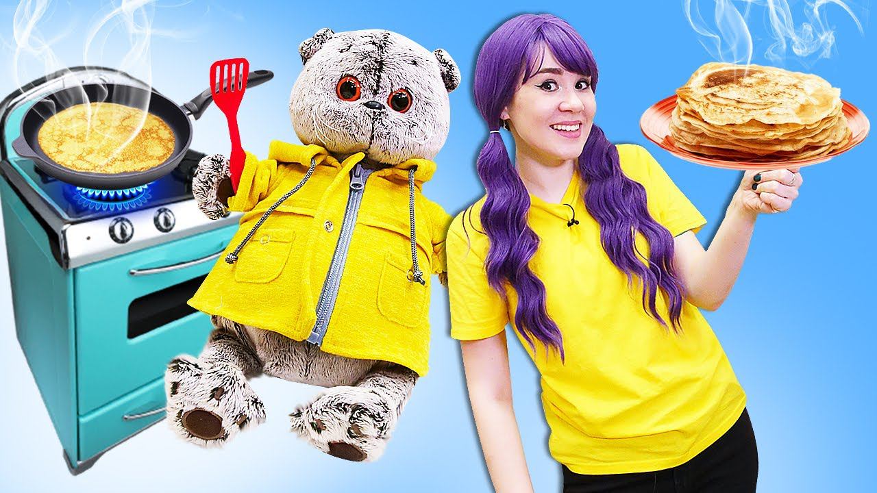 Видео для детей игры готовка с игрушками. Кот Дымок и Валя собрались пить чай. Дымок увидел на кухне много разных сковородок. Оказывается, большая и тонкая сковорода используется для приготовления блинов. Дымок ещё не пробовал блины. Валя предложила их приготовить. Тесто для блинов мешают миксером - он помогает быстро перемешать все ингредиенты. Потом тесто выливают на сковороду и обжаривают с двух сторон. К блинам можно добавить сметану, сгущенку, мясную начинку. И любимые Дымком бананы! Отличное чаепитие получилось! Самые новые серии в приложении Капуки Кануки - скачай и смотри первым: https://l.projectfirst.tv/KKappRU