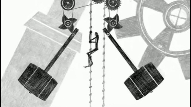 Повествование-размышление о наркозависимости,переданное посредством изображения персонажей,попавших в тиски сложного механизма.