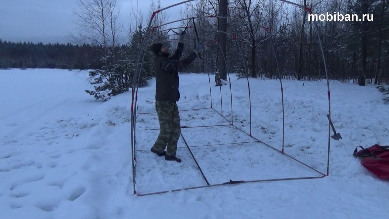 Мобильная баня и отапливаемая палатка Мобиба МБ-552 М2: http://mobiban.ru/mb-552-m2.php Установка в лесу в реальных условиях при отрицательной температуре. Несмотря на свои габариты, сборка доступна одному человеку. Вдвоём установка происходит быстрее... Подробная схема по установке доступна здесь: http://mobiban.ru/sborka_modeli_mb-552_m2_video.php