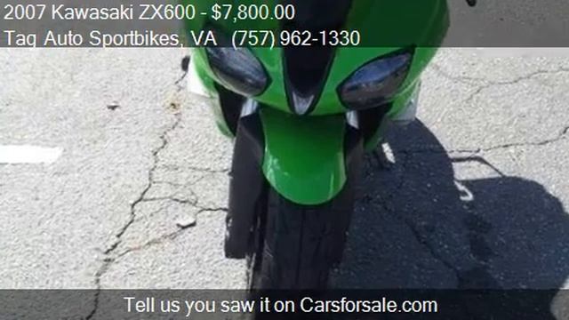 This 2007 Kawasaki ZX600 is for sale in Virginia Beach, VA 23464 at Tag Auto Sportbikes. Contact Tag Auto Sportbikes at http://www.tagautosportbikes.com or http://www.carsforsale.com/used_cars_for_sale/dealerinventory.aspx?dealerid=417280 Engine: Unspecified Transmission: Unspecified Color: White Mileage: 9960 Contact Tag Auto Sportbikes 792 S Military Hwy Virginia Beach, VA 23464 to test drive this 2007 Kawasaki ZX600 today.