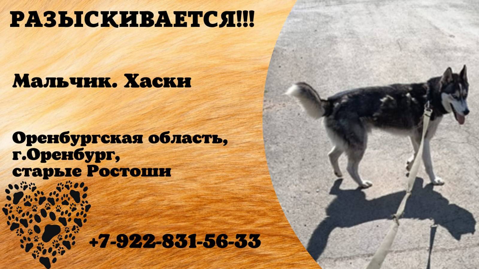 Оренбургская Оренбург Пропала собака Пропала собака хаски Сбежал в старых Ростошах Большая просьба, если будет любая информация по нему, сообщите по номеру 89228315633 Инфо https://vk.com/wall-198815410_154052 Автор https://vk.com/id290940122