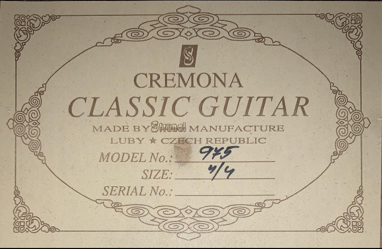 Гитара Cremona 975 Верхняя дека: Цельный массив кедра Нижняя дека и обечайка: Индийский палисандр Гриф: Махагон (красное дерево) Накладка: Палисандр Подставка: Палисандр Лады: 18 Мензура: 650 мм Колки: Латунное покрытие Форма корпуса: Классическая Окантовка: Есть, из красного дерева Цвет гитары: Натуральный Производитель: Чехия