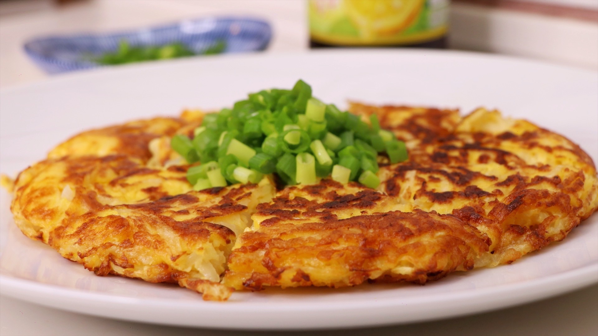 Ингредиенты: 1. Редька Дайкон - 300 г. 2. Яйцо - 1 шт. 3. Пшеничная мука - 2 ст.л. 4. Рыбный бульон Даши - 0,5 ч.л. 5. Масло растительное - 1 ст.л. 6. Масло кунжутное - 2 ч.л. 7. Зеленый лук - по вкусу.