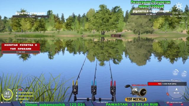 Поддержка донатом https://www.donationalerts.com/r/kalyamba11 Альтернативный донат https://new.donatepay.ru/@1032463 Если стрим лагает,смотри стрим на трово https://trovo.live/s/Kalyamba_na_Ribalke ТОП 1 ДОНАТЕР МЕСЯЦА поддерживающий трансляции получит подарок в виде катушки TAIGA c40 2s Мой ВК - https://vk.com/kalyantv НИК в игре kalyan11 НАШ ДИСКОРД СЕРВЕР https://discord.gg/mSbnTJK8TB Заказ водоема на 1 час - 500р ( весь стрим 2500р ) Модерка на канале 1100р ( каждая следующая на 100р больше) Озвучка доната на 40р,50р,100р,200р,300р,500р,1000р ✅Призы в рулетке "ПРЕМИУМНАЯ" ✔ ЗОЛОТО ✔ ПРЕМ ✔ КАТУШКИ РАПТОР 40, АЗИМУТ 10000, СИЛЬВЕР 80, ТАЙГА с 30 ЮБИЛЕЙНАЯ, ✔ ПАЛКИ ПИЛКЕРНАЯ, ДОНКА МОРСКИЕ, ТОП КАСТИНГ ✔ РОД ПОД, СТУЛЬЯ ✅Призы в рулетке СТАНДАРТ : ✔ катушка "РАПТОР 40" ✔ катушка "АЗИМУТ 10000" ✔ катушка "ТАЙГА С30, С40, С30 (юбилейная)" ✔ катушки 60 для медного ( ЭВИИ, НАТОРЫ, ГОЛДА, и тд) ✔ ПИЛКЕРНОЕ УДИЛИЩЕ КОРОЛЕВА ОКЕАНА ✔ Тяжелый кастинговый спиннинг "Барракуда" ✔ Морское Донное удилище ✔ прем ( 3, 7, 30 дней) ✔ золото ( 1, 3, 5, 10, 20 ,50) ✔ билет на море ( 1, 3, 5 дней) ✔ голд наживка и др. ✅Призы в рулетке "СТАРТОВАЯ" ✔ катушка "silver80" ✔ катушка "БЕЛЫЙ КАЛИБР" ✔ катушка "Черный калибр" ✔ катушка "Протон" ✔ катушка "Нарга 6000" ✔ Набор Фидерист и спинингист ✔ Карповик Фортуна ✔ фидерные удилища ✔ прем, золото, алкашка, наживки и тд P.s Рулетка это не казино, а награда за поддержку стримера. Вечный ТОП ПОДДЕРЖКИ (11.05.2024) 1. Dimon_pokemonchik 119 784 2. Interceptor 75 508 3.Skreb79 71 261 4. une personne 68 619 5. Нарвал77 31 550