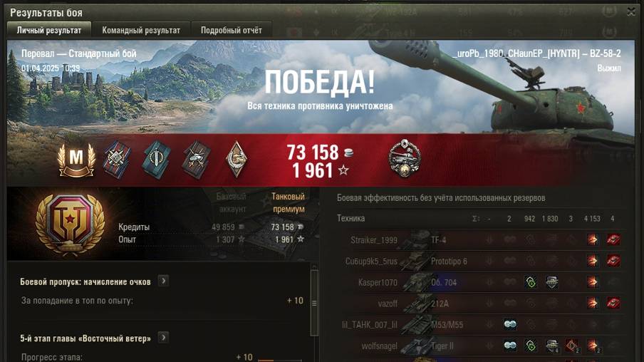 ПЕРЕВАЛ МАСТЕР на BZ-58-2 ОПЫТ: 1245 СУММАРНЫЙ УРОН: 5095 ШАНС на ПОБЕДУ - 42%